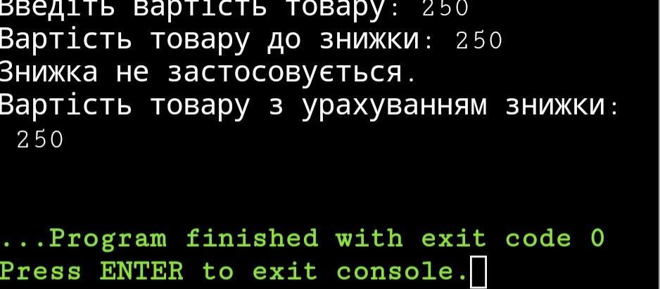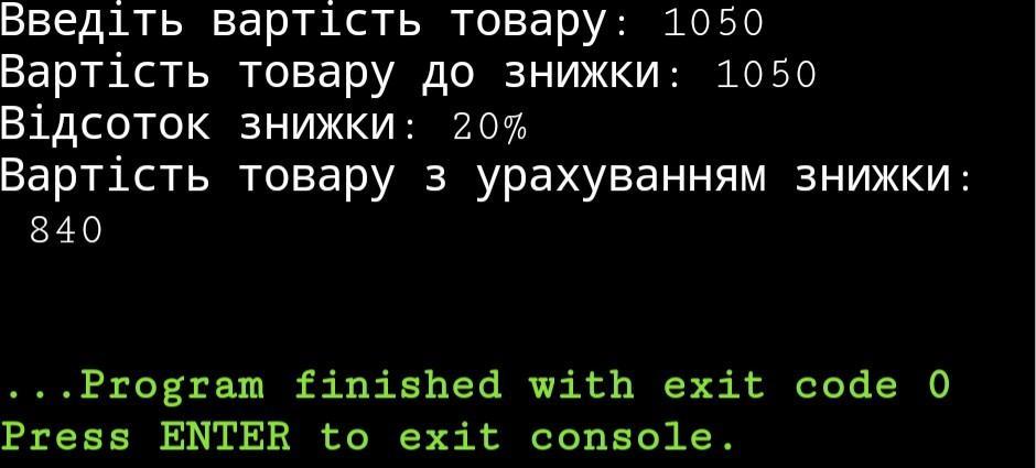 Програма повинна виводити на екран вартість покупки до та після застосування знижки. Вводимо вартість з клавіатури.
