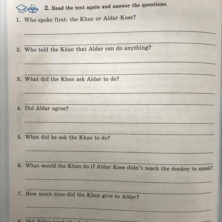 2.Read the text again and answer the guestions.1.Who spoke first:the Khan or Aldar Kose.Пожалуйста,плиз помогите!!!