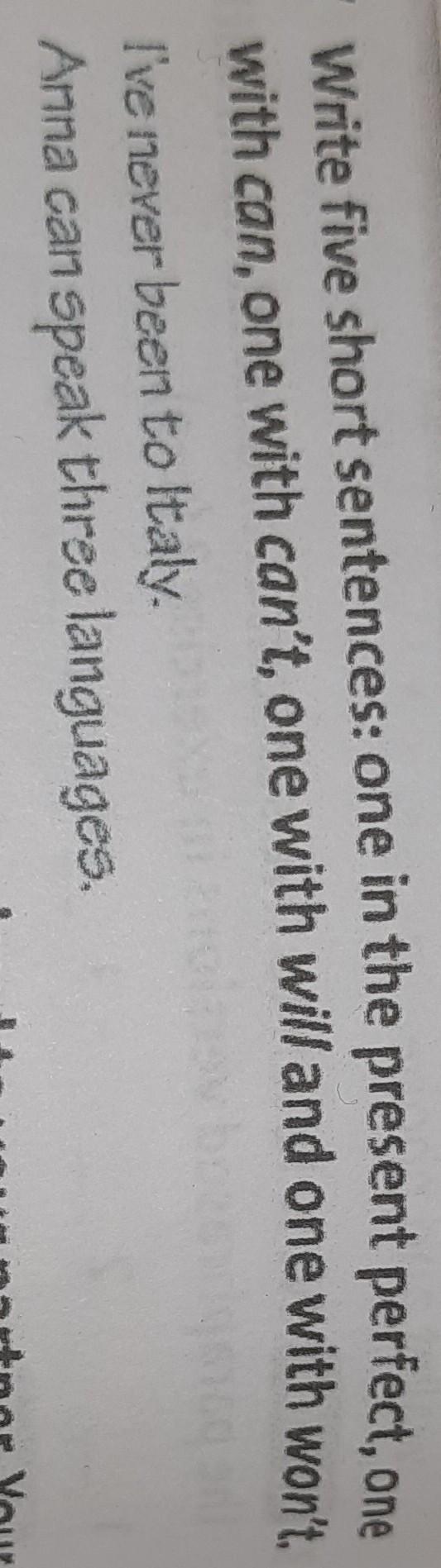7 Write five short sentences: one in the present perfect, one with can, one with can't, one with will and one with won't.