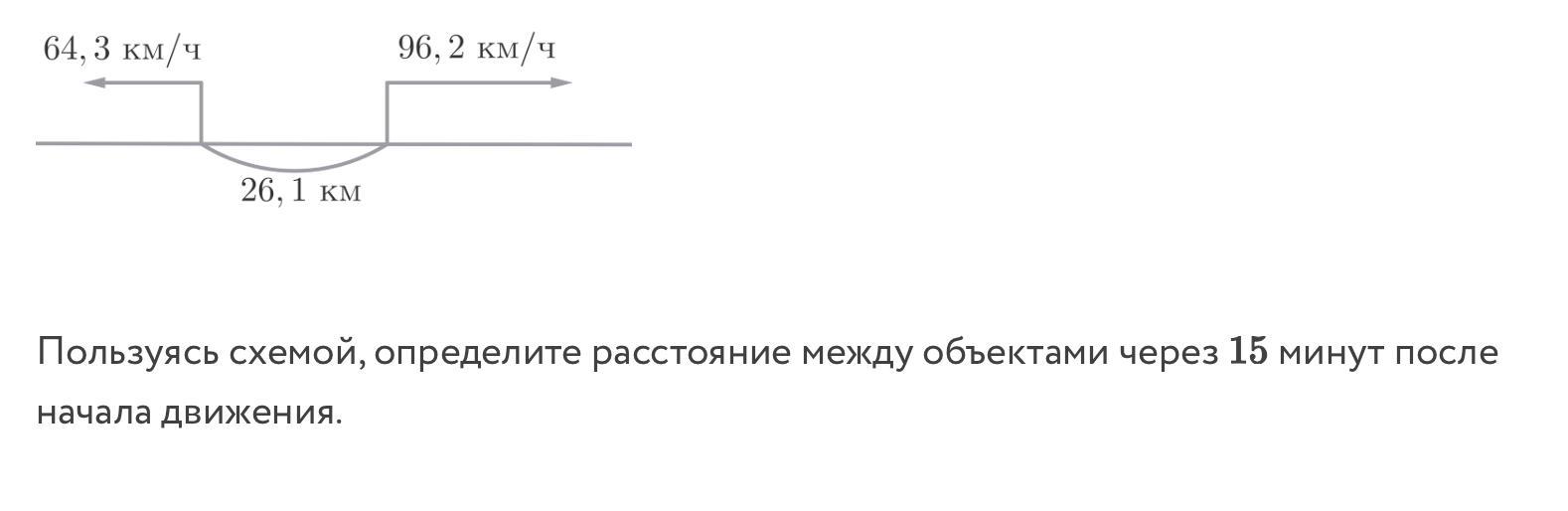 Скорость 1 объекта (слева) = 64,3 км/ч, 15 минут- 1/4 часа. Через 15 минут он пройдет ещё