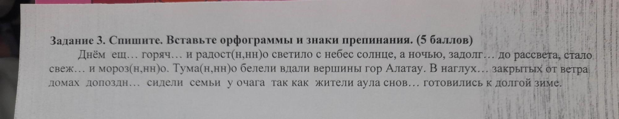 Задание 3. Спишите. Вставьте орфограммы и знаки препинания. Днём ещ... горяч... и радост(н,нн)о светило с небес солнце, а ночью, задолг... до рассвета, стало свеж... и мороз(н,нн)о. Тума(н,Hн) белели вдали вершины гор Алатау. В наглух... закрытых от ветра домах допоздн... сидели семьи у очага так как жители аула снов... готовились к долгой зиме.