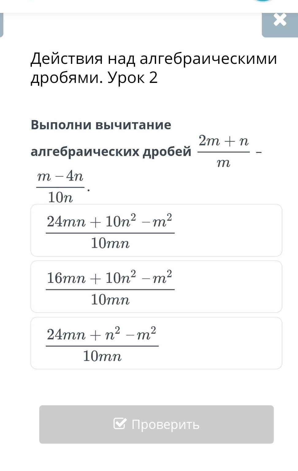 Выполни вычитание алгебраических дробей m-4n 10n 24mn + 10n2 - m2 10mn 16mn + 10n2 - m² 10mn 24mn + n² - m² 10mn 2m + n m
