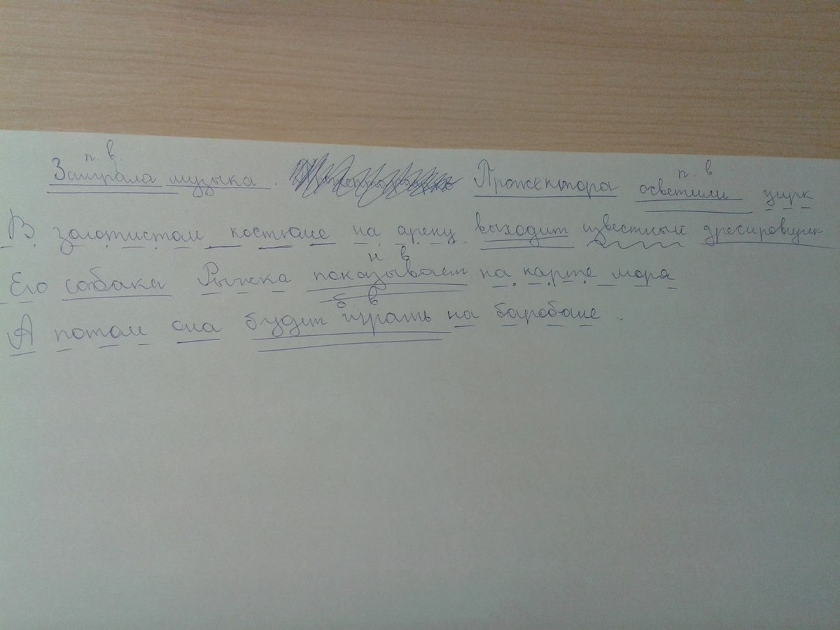 Подчеркни главные члены предложения . Над глаголами укажи время так п.в, н.в, б.в. Заиграла музыка. Прожектораярко осветили цирк, В золотистом костюме на арену выходит известный дресировщик. Его собака Рыжка показывает на карте моря. А потом она будет играть на баробане.