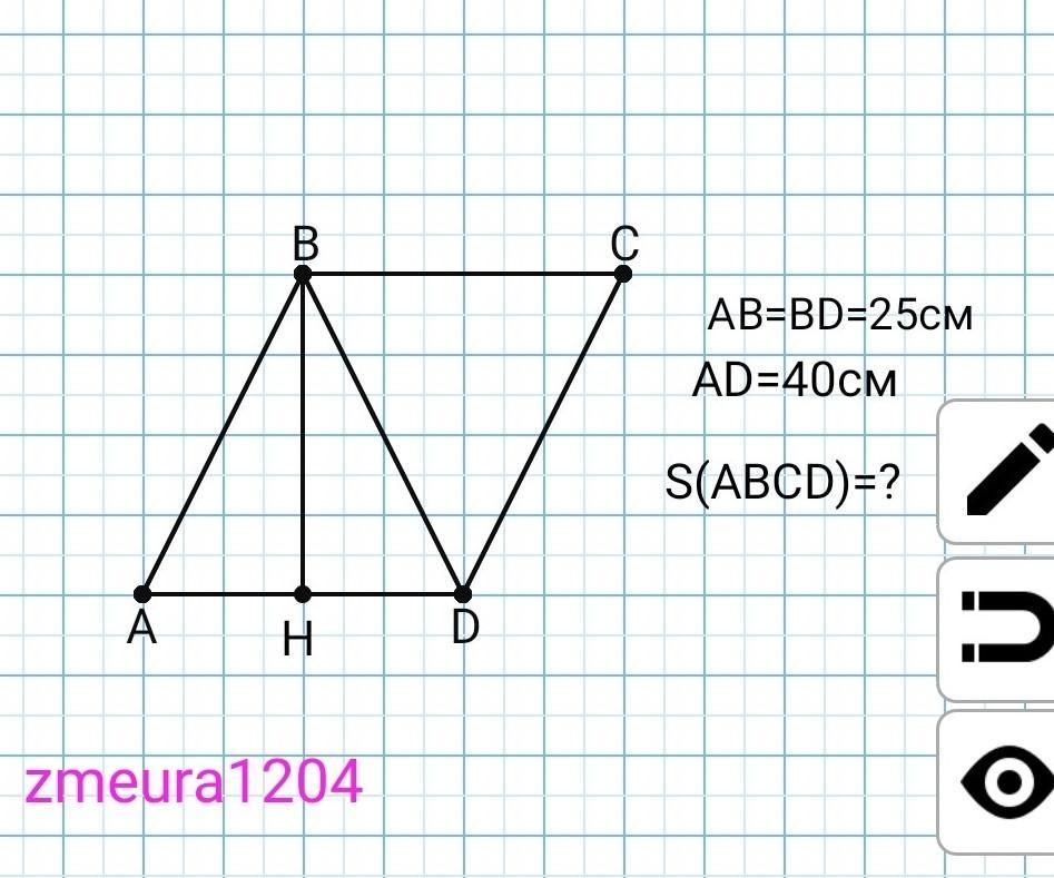 Сторона паралелограма AB дорівнює діагоналі BD довжиною 25 см, сторона AD дорівнює 40 см. Визнач площу паралелограма: