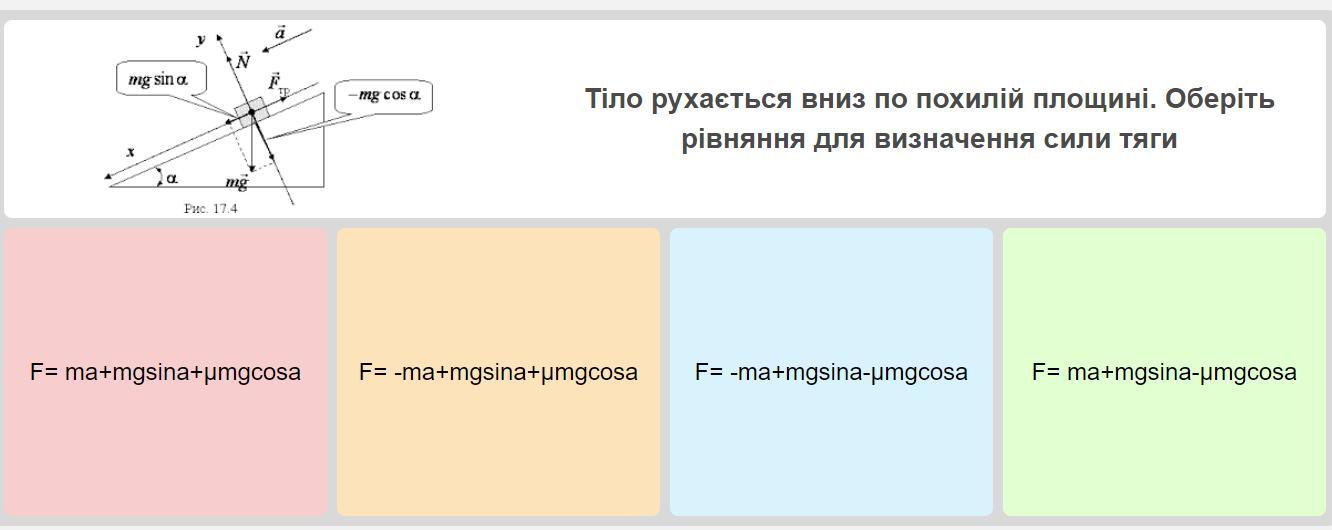 Тіло рухається вниз по похилій площині . Оберіть рівняння для визначення сили тяги