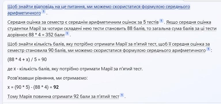 В університеті оцінка за семестр є середнім арифметичним оцінок за 5 тестів, які складають студенти і студентка протягом семестру. найбільша можлива оцінка за кожний тест дорівнює 100 балам. середня оцінка студентки Марії за чотири складені нею тести становить 88 балів. скільки балів має отримати Марія за 5 тест, щоб її оцінка за семестр становила 90 балів?