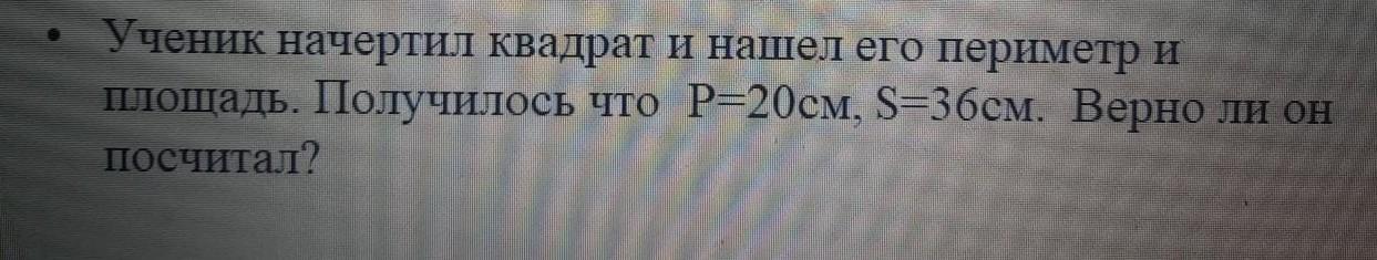 Ученик начертил квадрат и нашел его периметр и площадь. Получилось что P=20cм, S=36cm. Верно ли он посчитал?