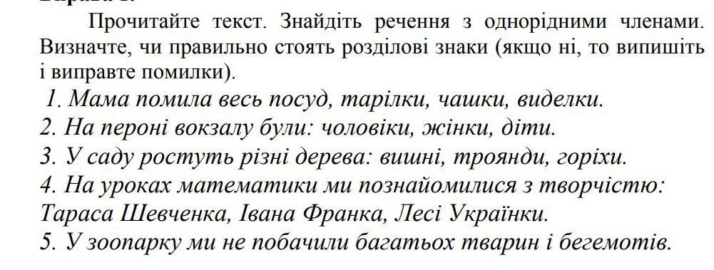 Прочитайте текст. Знайдіть речення з однорідними членами. Визначте, чи правильно стоять розділові знаки (якщо ні, то випишіть і виправте помилки). 1. Мама помила весь посуд, тарілки, чашки, виделки. 2. На пероні вокзалу були: чоловіки, жінки, діти. 3. У саду ростуть різні дерева: вишні, троянди, горіхи. 4. На уроках математики ми познайомилися з творчістю: Тараса Шевченка, Івана Франка, Лесі Українки. 5. У зоопарку ми не побачили багатьох тварин і бегемотів.