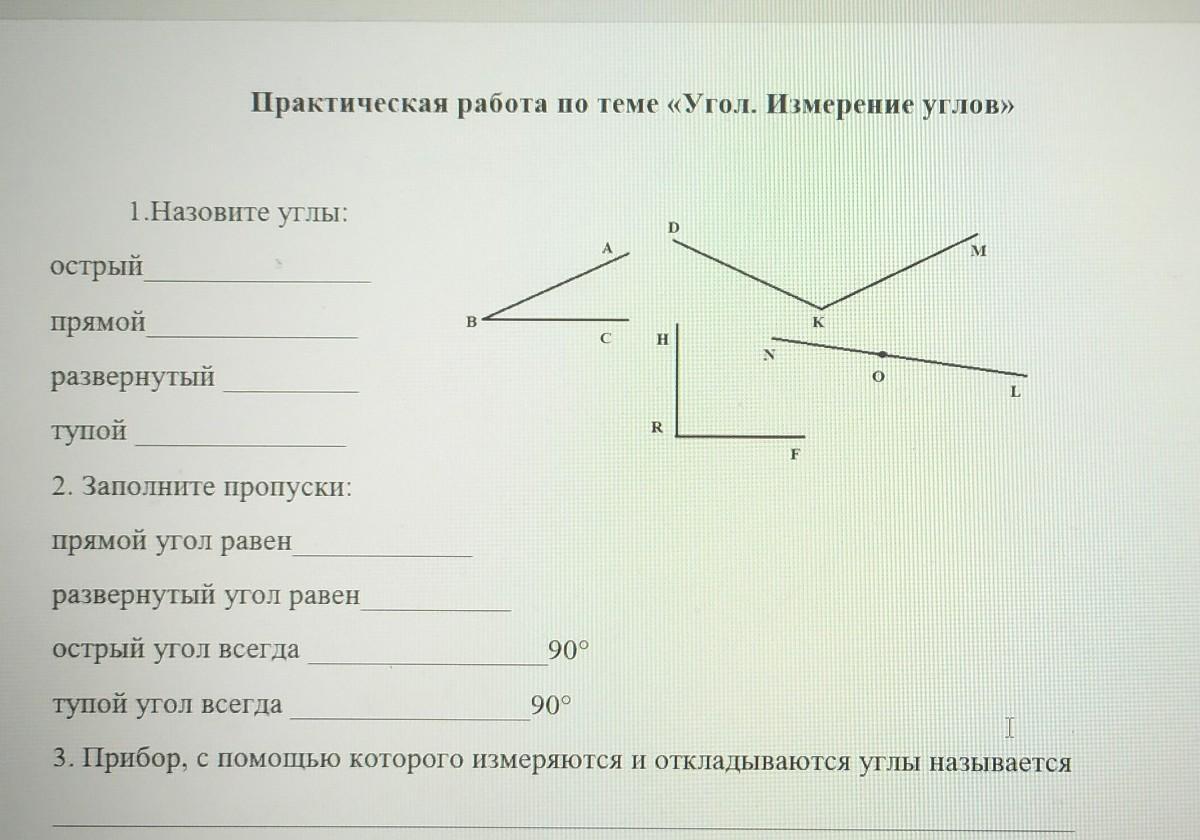 Практическая работа по теме «Угол. Измерение углов» 1.Назовите углы: острый прямой развернутый тупой B C D Н R N F K M L помогите плиз очеень надо