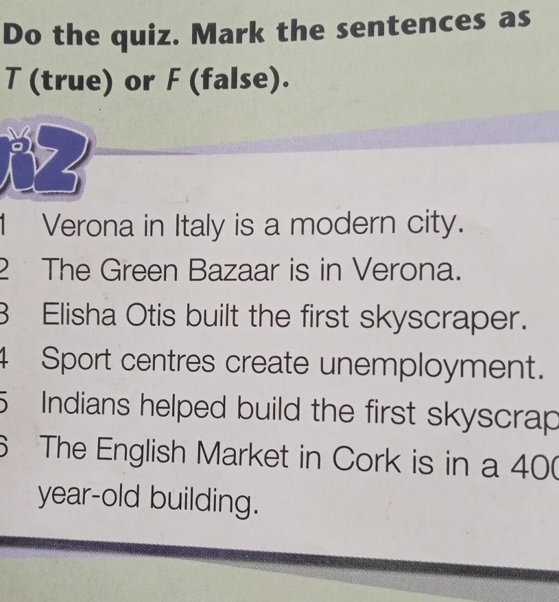 1 Verona in Italy is a modern city. 2 The Green Bazaar is in Verona. 3 Elisha Otis built the first skyscraper. 4 Sport centres create unemployment. 5 Indians helped build the first skyscraper. 6 The English Market in Cork is in a 400- year-old building. QUIZ