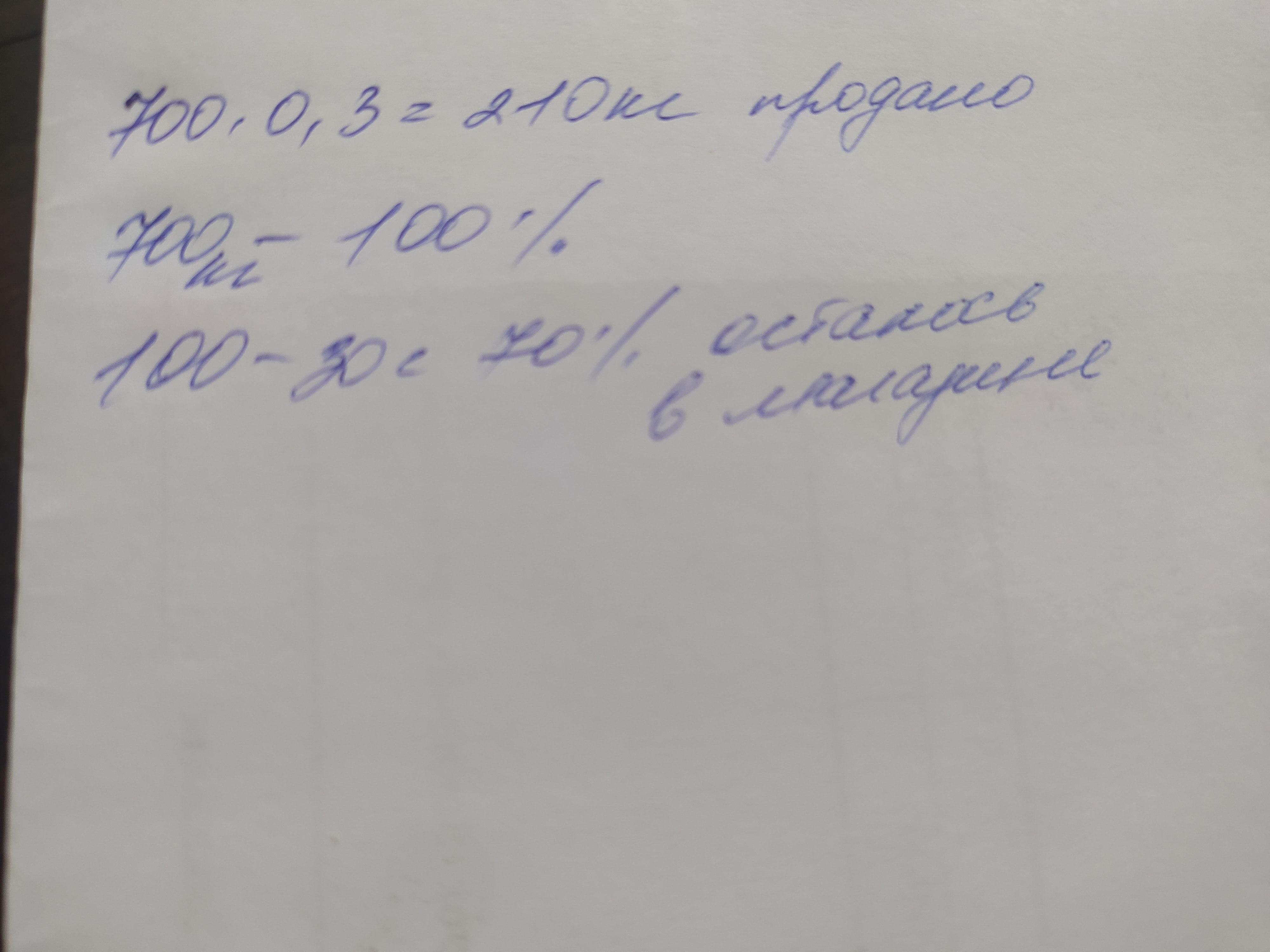 В магазине из 700 кг яблок продано 30% этого количества. Сколько кг яблок было продано? Сколько яблок в процентах осталось в магазине?