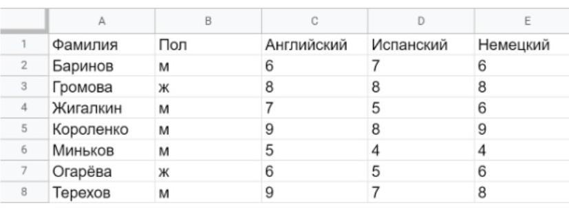 ((Пол = 'м') И (Немецкий = Английский)) ИЛИ ((Пол = 'ж') И (Испанский = Немецкий))