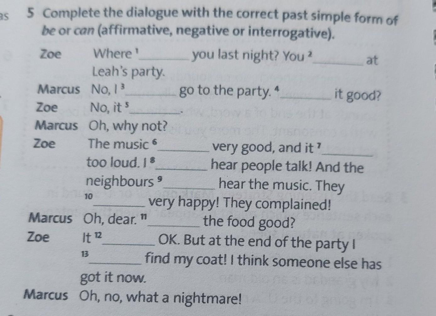Нужно закончить диалог, используя глаголы be и can в прошедшем времени.