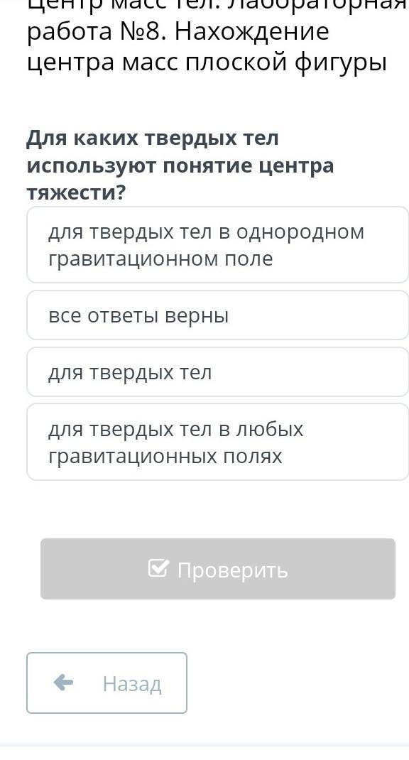 Для каких твердых тел используют понятие центра тяжести? для твердых тел в однородном гравитационном поле все ответы верны для твердых тел для твердых тел в любых гравитационных полях