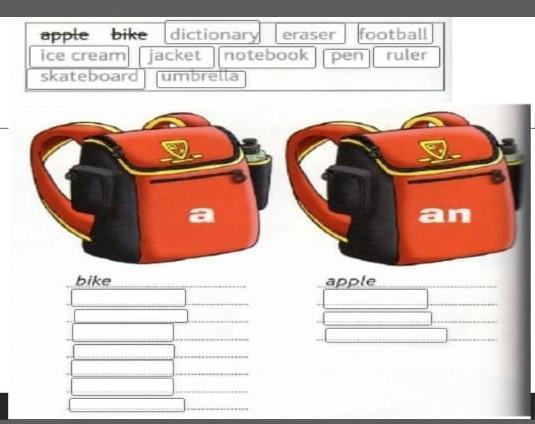 apple bike dictionary eraser football ice cream jacket notebook pen ruler skateboard umbrella bike apple an