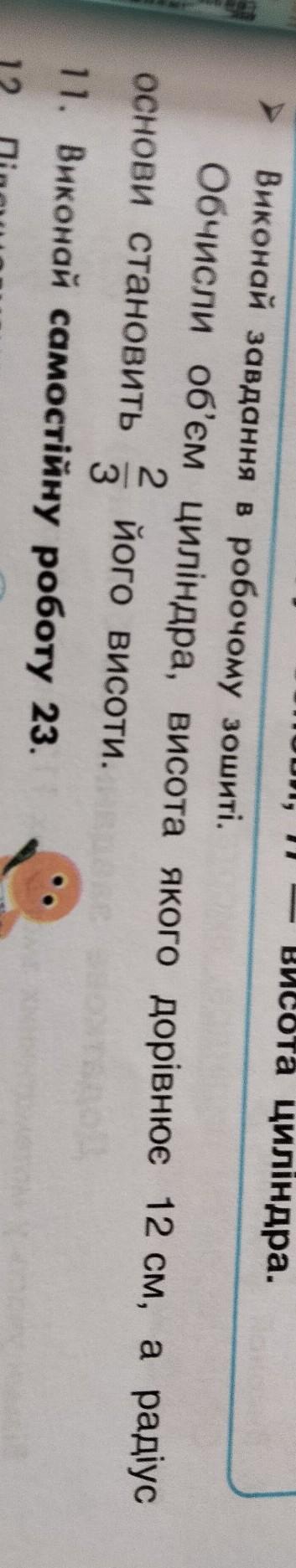 Виконай завдання в робочому зошиті. Обчисли об'єм циліндра, висота якого дорівнює 12 см, а радіус його висоти. ОСНОВИ становить 2 3. СРОЧНООО ДАЮ 30 БАЛОВ