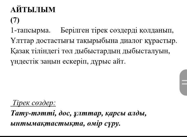 АЙТЫЛЫМ (7) 1-тапсырма. Берілген тірек сөздерді қолданып, Ұлттар достастығы тақырыбына диалог құрастыр. Қазақ тіліндегі төл дыбыстардың дыбысталуын, үндестік заңын ескеріп, дұрыс айт. Тірек сөздер: Тату-тәтті, дос, ұлттар, қарсы алды, ынтымақтастықта, өмір сүру.