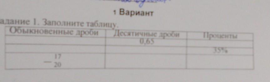 Задание 1. Заполните таблицу. Обыкновенные дроби 17 20 Десятичные дроби 0.65 Проценты 35%