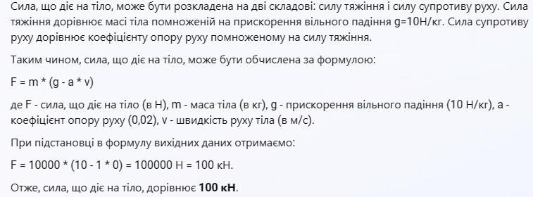 Тіло, масою 10т рухається з місця з прискоренням 1 м/с2. Обчисліть силу, що діє на тіло, якщо коефіцієнт опору руху дорівнює 0,02. (g=10Н/кг, відповідь у кН)