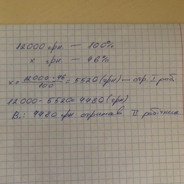 За виконану роботу два робітники отримали винагороду 12 000 грн. Перший отримав 46 % даної суми. Яку суму отримав другий робітник?