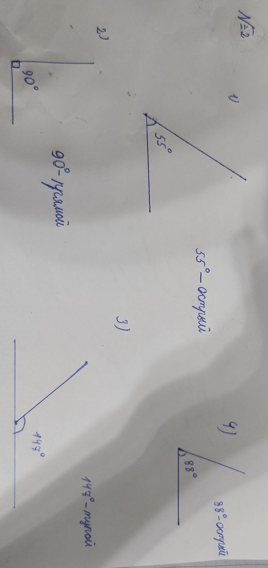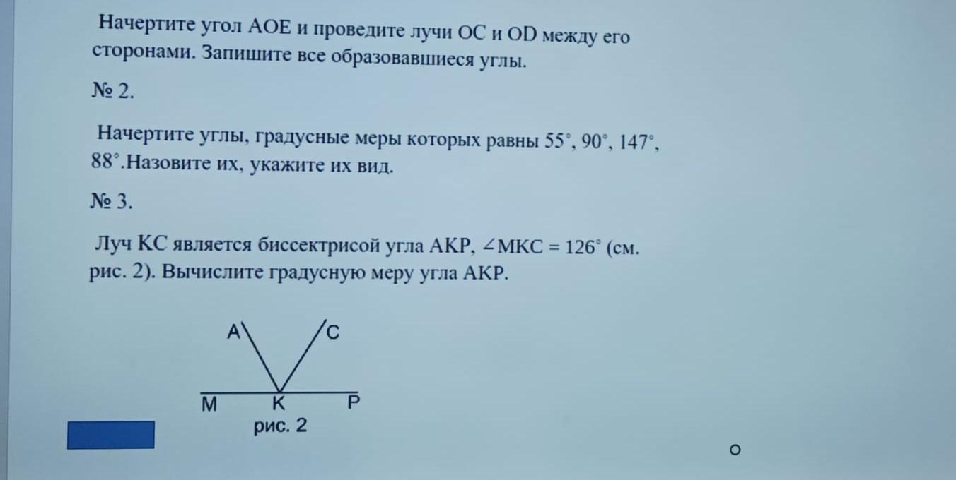 Начертите угол АОЕ и проведите лучи ОС и OD между его сторонами. Запишите все образовавшиеся углы. № 2. Начертите углы, градусные меры которых равны 55°, 90°, 147°, 88°.Назовите их, укажите их вид. № 3. Луч КС является биссектрисой угла АКР, -МКС = 126° (см. рис. 2). Вычислите градусную меру угла АКР. M K рис. 2 P О