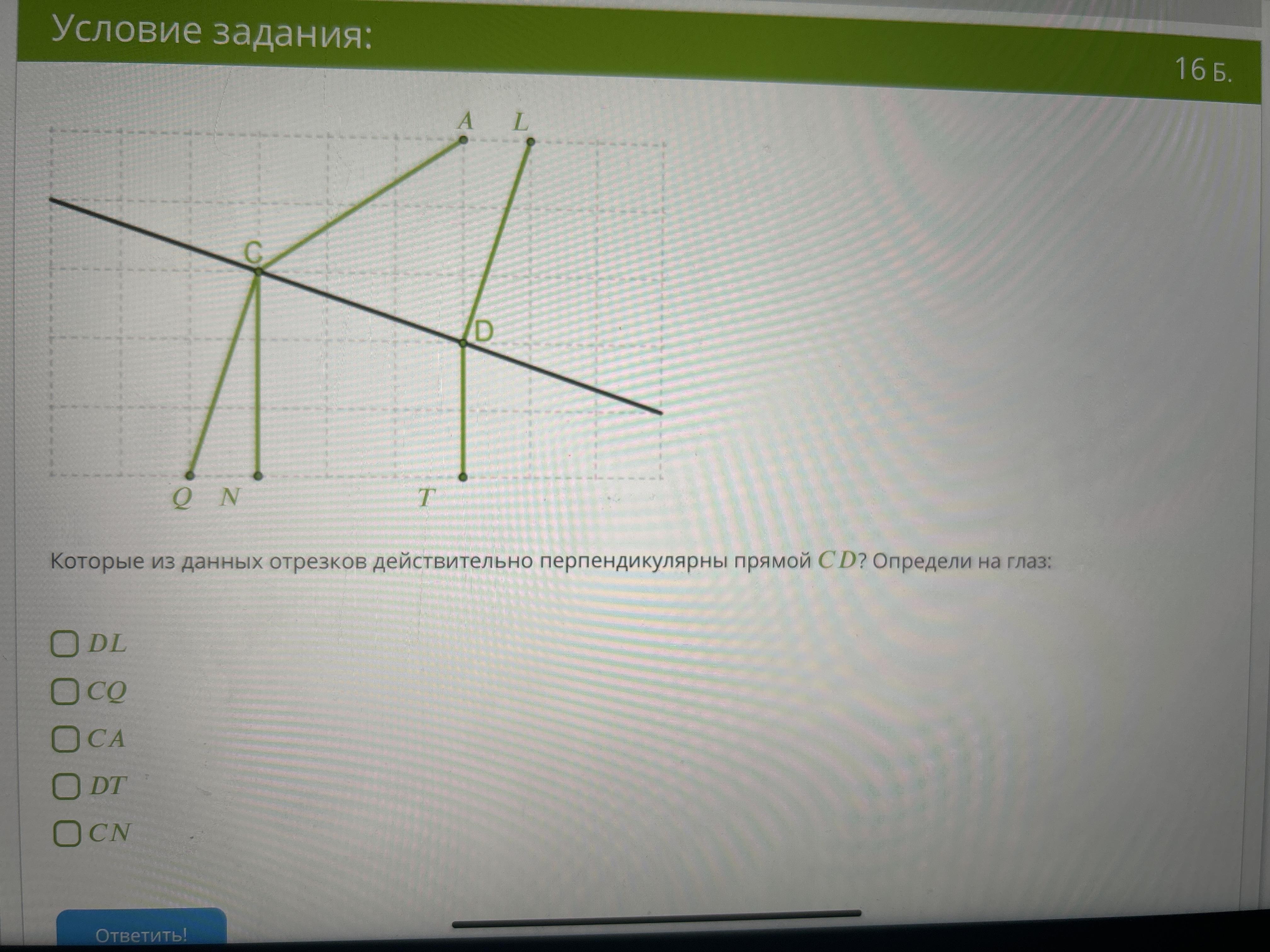 Которые из данных отрезков действительно перпендикулярны прямой СD?Опредили на глаз: