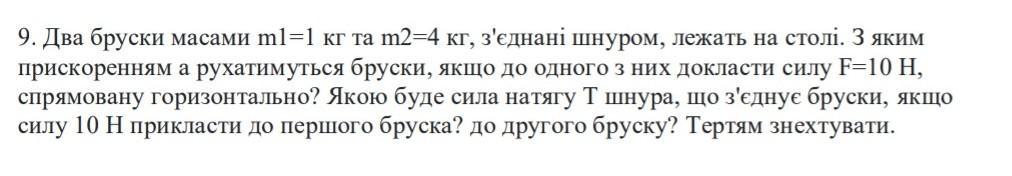 Два бруски масами m1=1 кг та m2-4 кг, з'єднані шнуром, лежать на столі. З яким прискоренням а рухатимуться бруски, якщо до одного з них докласти силу F=10 Н. спрямовану горизонтально? Якою буде сила натягу Т шнура, що з'єднує бруски, якщо силу 10 Н прикласти до першого бруска, до другого бруску? Тертям знехтувати.