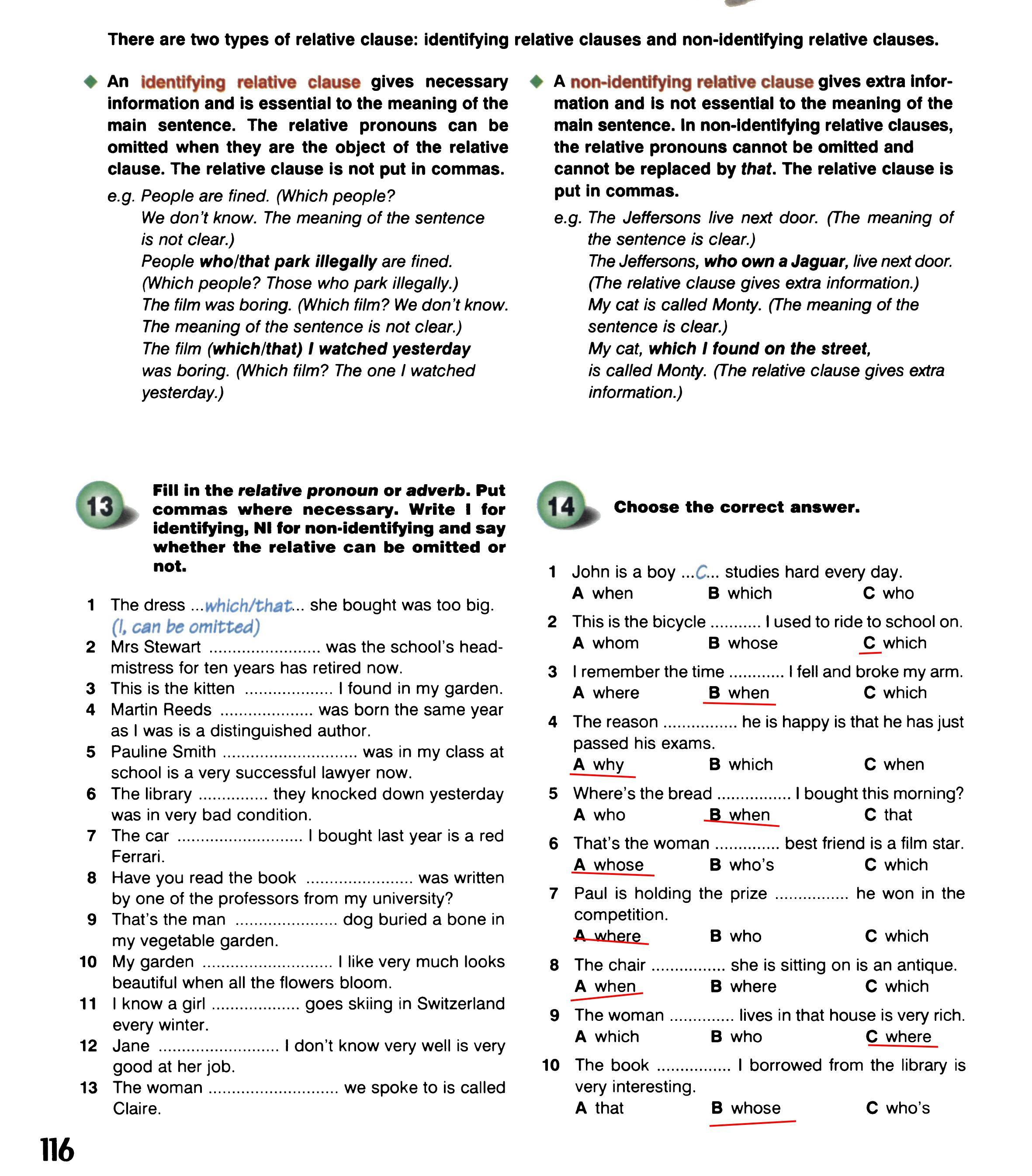 Срочно. 13. Fill in the relative pronoun or adverb. Put commas where necessary. Write I for identifying, NI for non-identifying and say whether the relative can be omitted or not.