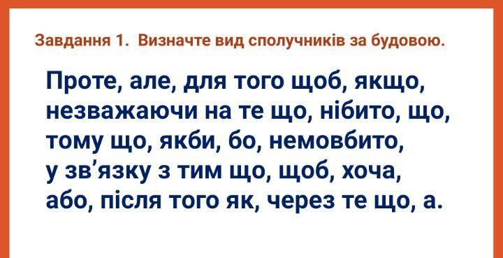 Завдання 1. Визначте вид сполучників за будовою. Проте, але, для того щоб, якщо, незважаючи на те що, нібито, що, тому що, якби, бо, немовбито, у зв'язку з тим що, щоб, хоча, або, після того як, через те що, а. срочно