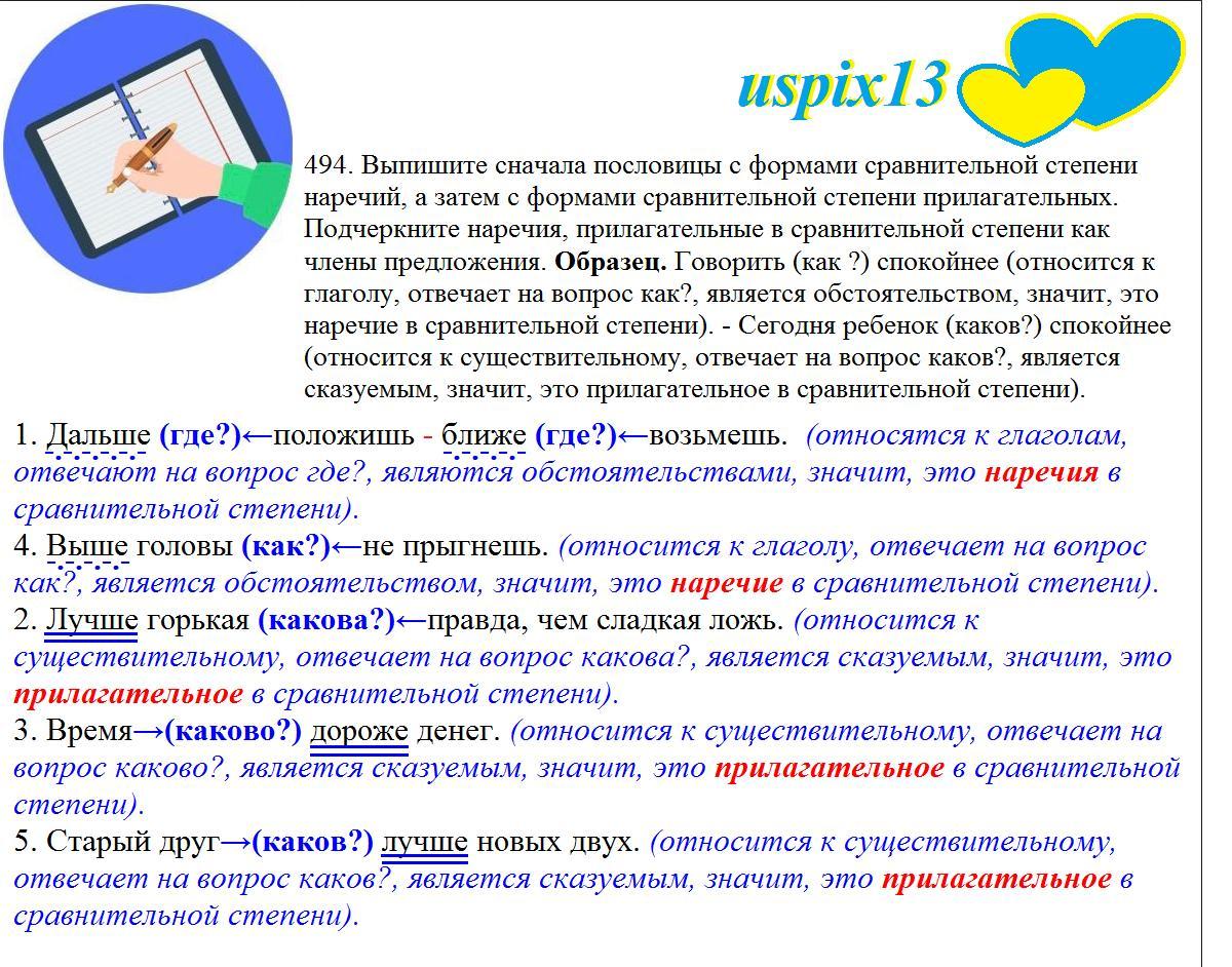 494. Выпишите сначала пословицы с формами сравнитель- ной степени наречий, а затем с формами сравнительной сте- пени прилагательных. Подчеркните наречия прилагательные в сравнительной степени как члены предложения. Образец. Говорить (как ?) спокойнее (относится к глаголу, отвечает на вопрос как?, является обстоятельством, значит, это наречие в сравнительной степени). - Сегодня ребенок (каков?) спокойнее (относится к существи- тельному, отвечает на вопрос како в?, является сказуемым, значит, это прилагательное в сравнительной степени). 1. Дальше положишь ближе возьмешь. 2. Лучше горькая правда, чем сладкая ложь. 3. Время дороже денег. 4. Выше го- ловы не прыгнешь. 5. Старый друг лучше новых двух. ПОМОГИТЕ ПЖ
