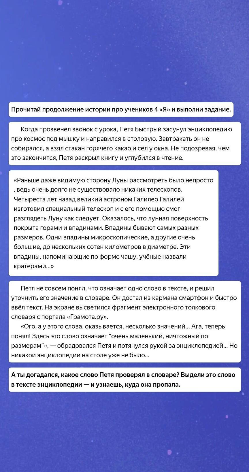 Прочитай продолжение истории про учеников 4 «Я» и выполни задание. Когда прозвенел звонок с урока, Петя Быстрый засунул энциклопедию про космос под мышку и направился в столовую. Завтракать он не собирался, а взял стакан горячего какао и сел у окна. Не подозревая, чем это закончится, Петя раскрыл книгу и углубился в чтение. «Раньше даже видимую сторону Луны рассмотреть было непросто , ведь очень долго не существовало никаких телескопов. Четыреста лет назад великий астроном Галилео Галилей изготовил специальный телескоп и с его помощью смог разглядеть Луну как следует. Оказалось, что лунная поверхность покрыта горами и впадинами. Впадины бывают самых разных размеров. Одни впадины микроскопические, а другие очень большие, до нескольких сотен километров в диаметре. Эти впадины, напоминающие по форме чашу, учёные назвали кратерами...» Петя не совсем понял, что означает одно слово в тексте, и решил уточнить его значение в словаре. Он достал из кармана смартфон и быстро ввёл текст. На экране высветился фрагмент электронного толкового словаря с портала «Грамота.ру». «Ого, а у этого слова, оказывается, несколько значений... Ага, теперь понял! Здесь это слово означает "очень маленький, ничтожный по размерам">>, -обрадовался Петя и потянулся рукой за энциклопедией... Но никакой энциклопедии на столе уже не было... А ты догадался, какое слово Петя проверял в словаре? Выдели это слово в тексте энциклопедии - и узнаешь, куда она пропала.
