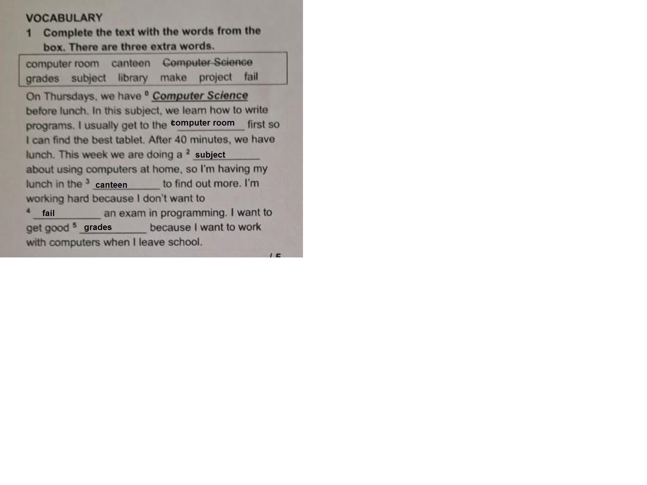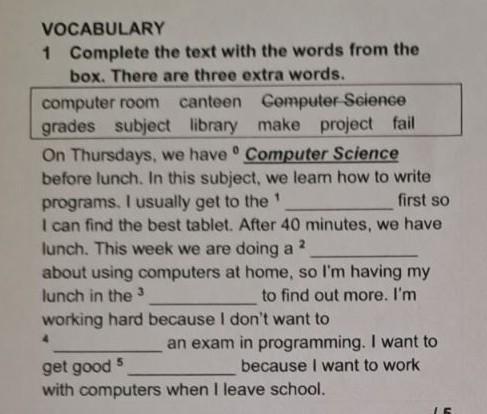 VOCABULARY 1 Complete the text with the words from the box. There are three extra words. computer room canteen Computer Science grades subject library make project fail On Thursdays, we have Computer Science before lunch. In this subject, we learn how to write programs. I usually get to the first so I can find the best tablet. After 40 minutes, we have lunch. This week we are doing a 2 about using computers at home, so I'm having my lunch in the 3 to find out more. I'm working hard because I don't want to 4 an exam in programming. I want to because I want to work get good 5 with computers when I leave school.
