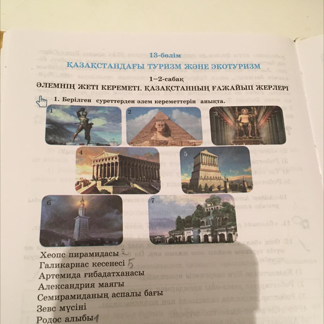 ОЧЕНЬ СРОЧНО ПОМОГИТЕ ПОЖАЛУЙСТА. 1. Берілген суреттерден әлем кереметтерін анықта.