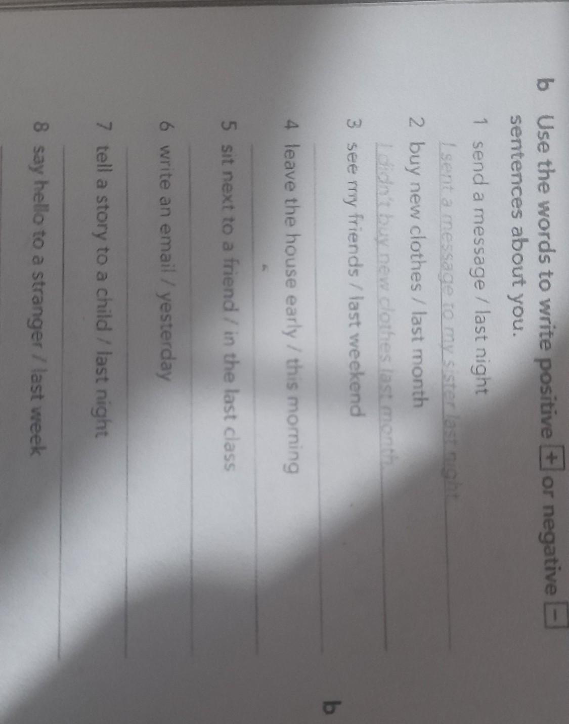 Saw 8 write b Use the words to write positive or negative sentences about you. 1 send a message / last night Lsent a message to my sister last night 2 buy new clothes / last month Ldidn't buy new clothes last month. 3 see my friends / last weekend 4 leave the house early/ this morning G 5 sit next to a friend/ in the last class 6 write an email / yesterday 7 tell a story to a child / last night 8 say hello to a stranger / last week срочно пжпжпжпжпжаж даю 30 баллов