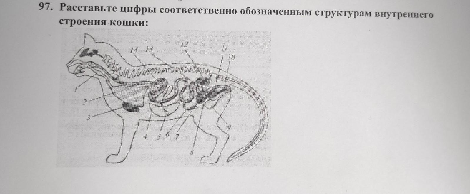 Расставьте цифры соответственно обозначенным структурам внутреннего строения кошки.