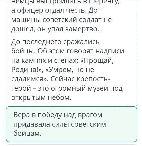 Защитники Брестской крепости Прочитай текст. Какое из предложенных утверждений раскрывает Основную мысль текста? Посмотреть текст Bepa B победу над врагом придавала силы советским бойцам. Надписи на камнях и стенах - свидетельства войны. Легенда о советском солдате. Огромный музей под открытым небом - это памятник войны.