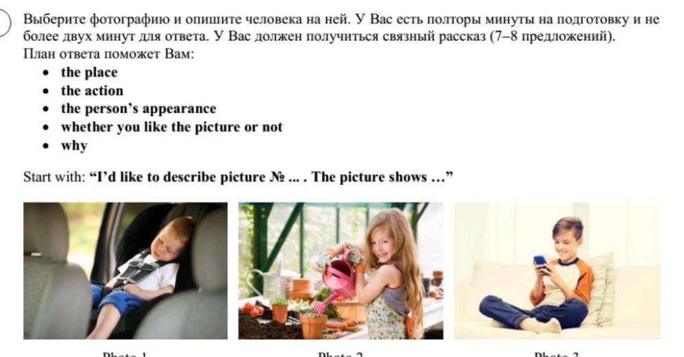 3 Выберите фотографию и опишите человека на ней. У Вас есть полторы минуты на подготовку и не более двух минут для ответа. У Вас должен получиться связный рассказ (7-8 предложений). План ответа поможет Вам: • the place • the action • the person's appearance • whether you like the picture or not • why Start with: "I'd like to describe picture № .... The picture shows ..." Photo 1 Photo 2 Photo 3
