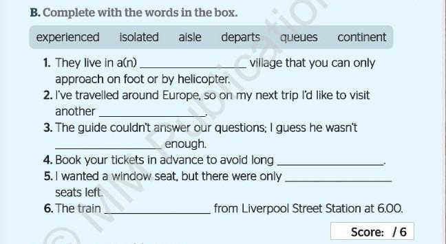 B. Complete with the words in the box. experienced 1. They live in a(n). approach on foot or by helicopter. 2. I've travelled around Europe, so on my next trip I'd like to visit another 3. The guide couldn't answer our questions; I guess he wasn't enough. 4. Book your tickets in advance to avoid long. 5. I wanted a window seat, but there were only seats left. 6. The train. isolated aisle departs queues continent village village that you can only from Liverpool Street Station at 6.00. Score: /6