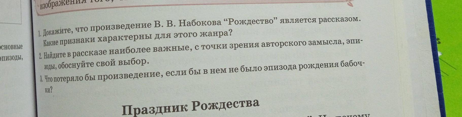1. Докажите, что произведение В. В. Набокова "Рождество" является рассказом, Какие признаки характерны для этого жанра? 2. Найдите в рассказе наиболее важные, с точки зрения авторского замысла, эпи- зоды, обоснуйте свой выбор. 3. Что потеряло бы произведение, если бы в нем не было эпизода рождения бабоч-ки?
