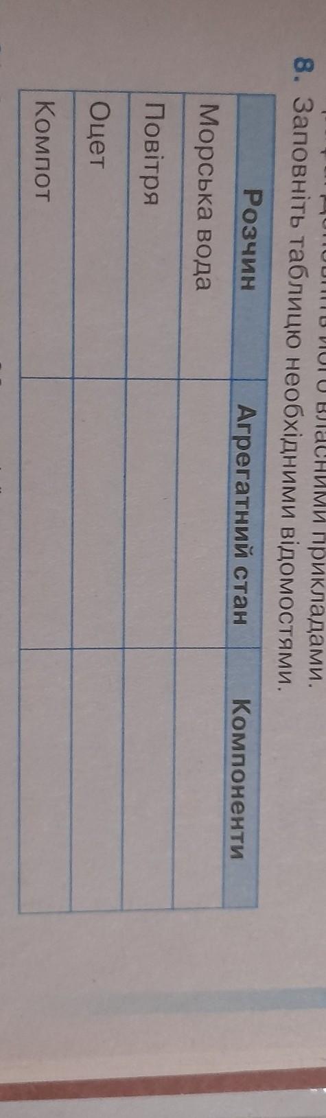 Дам 8. Заповніть таблицю необхідними відомостями. Агрегатний стан Розчин Морська вода Повітря Оцет Компот Компоненти СРОЧНО