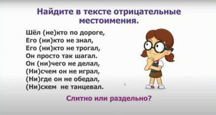 Найдите в тексте отрицательные местоимения. шёл (не)кто по дороге, Его (ни)кто не знал, Его (ни)кто не трогал, Он просто так шагал. Он (ни)чего не делал, (Ни)счем он не играл, (Ни)где он не обедал, (Ни)скем не танцевал. Слитно или раздельно?