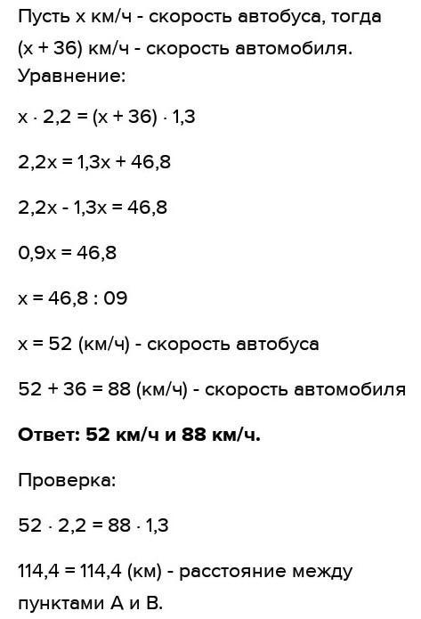 Відстань між пунктами A і B автомобіль проїхав за 1,3 години, а автобус — за 2,2 години. Знайди швидкість кожної машини, якщо автомобіль рухався на 36 км/год швидше, ніж автобус.