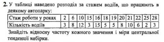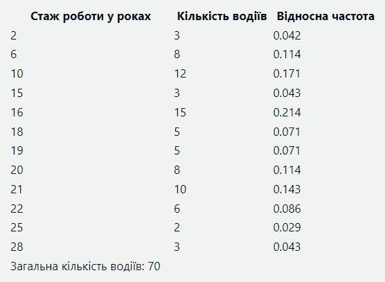 Для знаходження відносної частоти кожного значення потрібно поділити кількість водіїв з певним стажем на загальну кількість водіїв (скріншот закріплений).