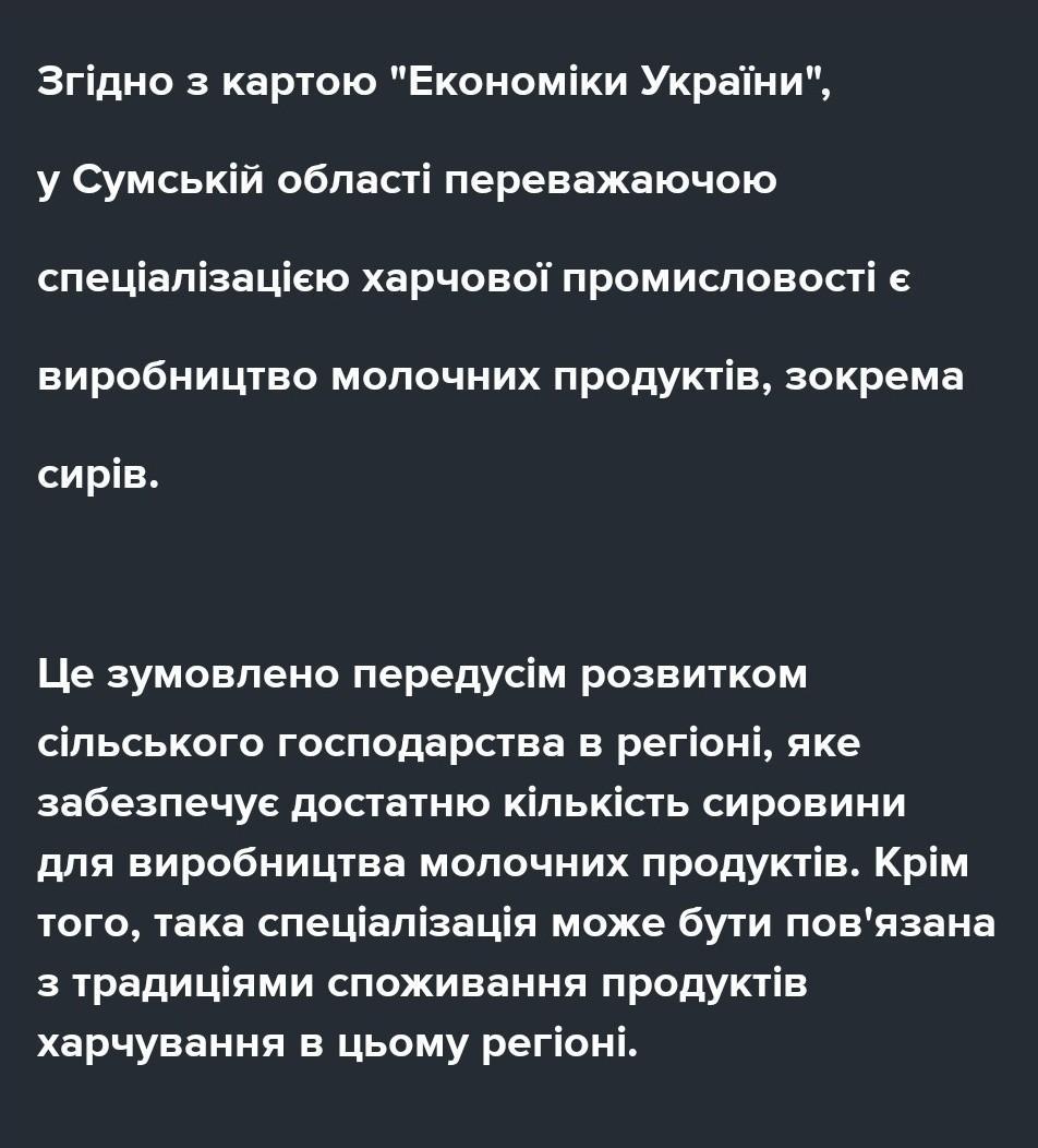5. Користуючись картою «Харчова промисловiсть України», визначте переважаючу спеціалізацію харчової промисловості у вашому регіоні. Чим вона зумовлена?