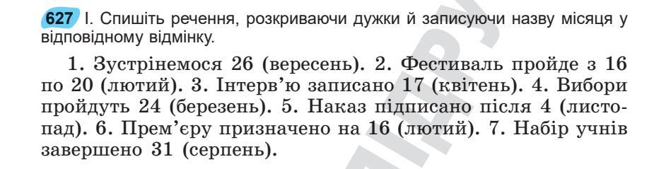 1.Зустринемося 26 вересня.2. Фестиваль пройде з 16 по 20 лютого. 3. Інтерв'ю записано 17 квітня. 4. Вибори пройдуть 24 березня. 5. Наказ підписано після 4 листопада. 6. Прем'єру призначено на 16 лютого. 7. Набір учнів завершено 31
