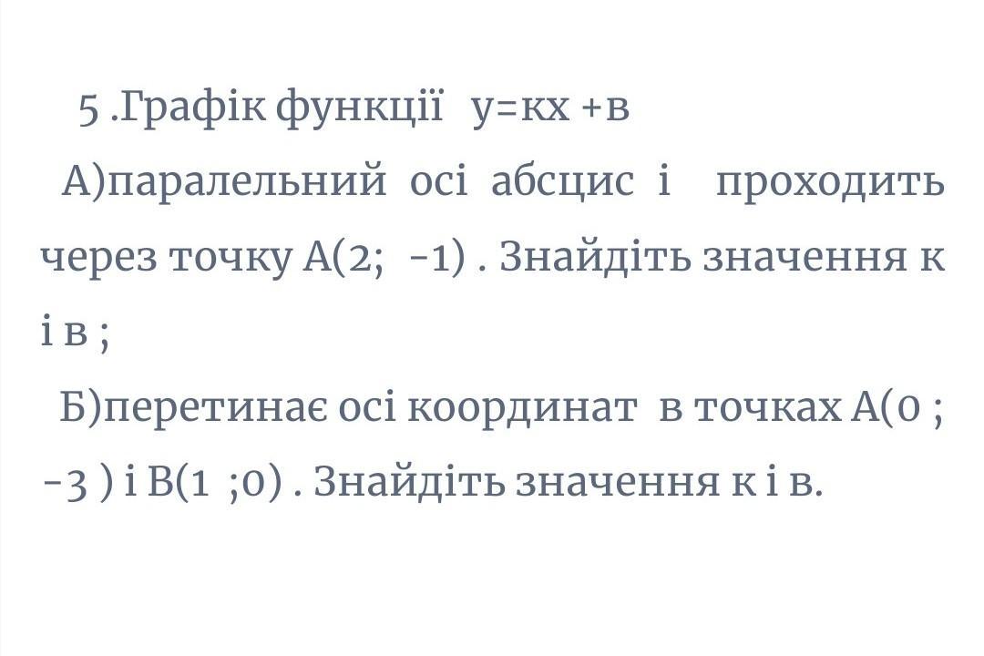 5 .Графік функції у=кх+в осі абсцис і А)паралельний проходить через точку А(2; -1). Знайдіть значення К ів; Б)перетинає осі координат в точках A(0 ; −3) iB(1;0). Знайдіть значення к і в.