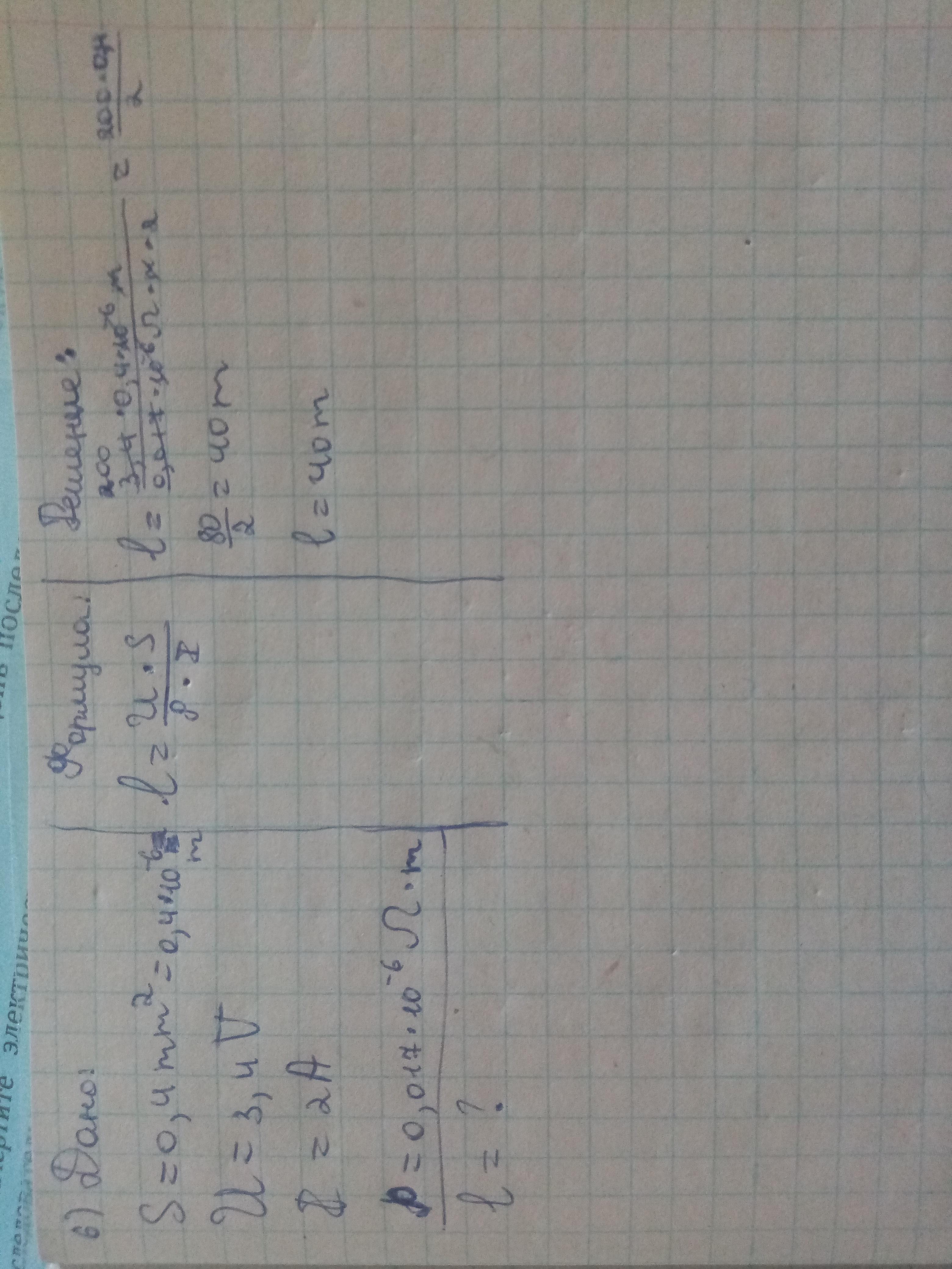 Определите длину медного провода площадью попе- речного сечения 0,4 mm², если при приложенном к его кон- цам напряжении 3,4 V по нему протекает ток 2 А.