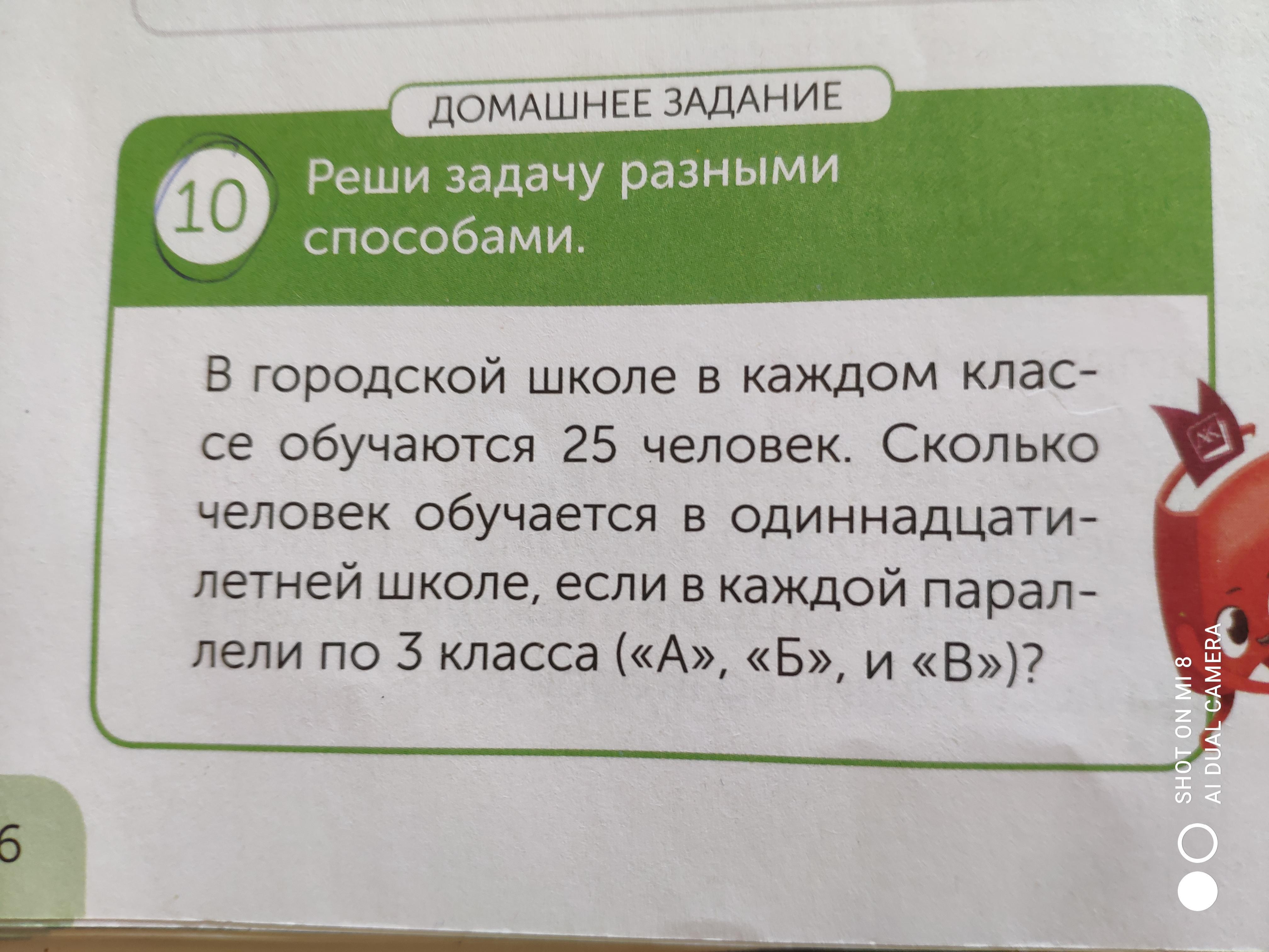 В городской школе в каждом классе обучается 25 человек. Сколько человек обучается в одиннадцатилетней школе, если в каждой параллели по 3 класса ( "А", "Б", "В")?