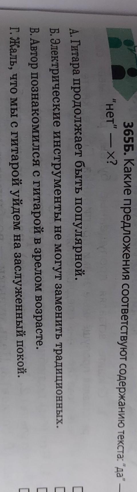 365Б. Какие предложения соответствуют содержанию текста: "да" -, "нет" -х? А.Гитара продолжает быть популярной. Б. Электрические инструменты не могут заменить традиционных. В. Автор познакомился с гитарой в зрелом возрасте. Г. Жаль, что мы с гитарой уйдем на заслуженный покой.