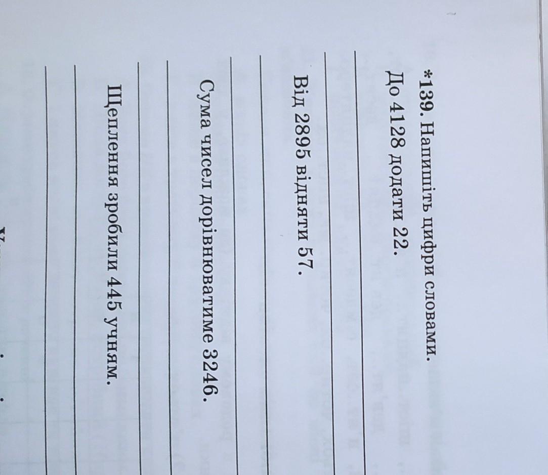 До чотири тисячі сто двадцять вісім додати двадцять два, від двох тисяч вісім сое дев'яносто п'яти відняти п'ять десят сім, сума чисел дорівнюватиме три тисячі двісті сорок шість, Щеплення зробили чотириста сорока п'яти учням